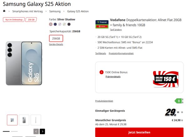Schöner Deal von MediaMarkt zum Wochenende, dort bekommt ihr das Samsung Galaxy S25 mit einer Vodafone Doppekkarten-Aktion für 24,98€/Monat.