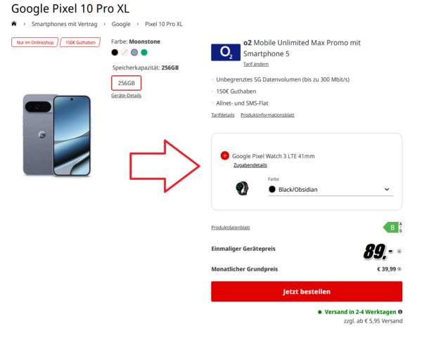 Starker Deal seitens MediaMarkt, dort bekommt ihr das Google Pixel 10 Pro XL + Unbegrenztes 5G + Alles-Flat im o2-Netz für 39,99€/Monat + Zuzahlung.