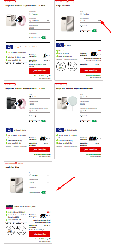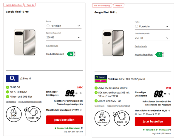 Schöner Deal seitens MediaMarkt, dort bekommt ihr das Google Pixel 10 Pro gute Verträge im o2-Netz/Telekom-Netz für 19,99€/Monat. (bitte nach unten scrollen, Angebote erst weiter unten sichtbar!)