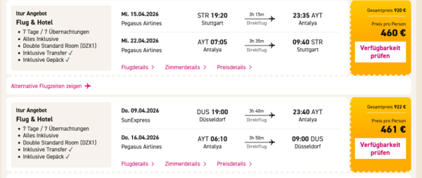 Hier mal ein Last Minute Angebot bei ltur. Sowie wenn man bis im April 2026 buchen möchte. Es gibt aber auch das Ganze als Lastminute jetzt im November für um die ~500€