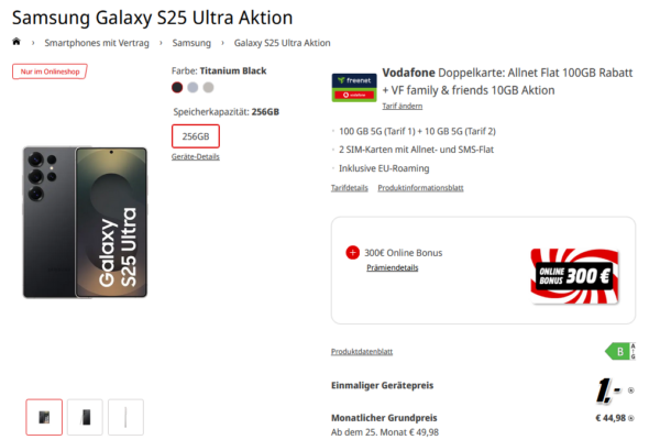 Und hier noch ein Deal von MediaMarkt zum Wochenende, dort bekommt ihr das Samsung Galaxy S25 Ultra mit einer Vodafone Doppekkarten-Aktion für 44,98€/Monat.