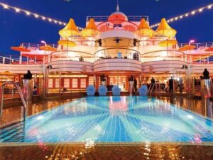 - Unterhaltung wird selbstverständlich auch den Kindern geboten, wie etwa mit spannenden Playstation-Wettbewerben, in einem Grand-Prix-Rennwagen-Simulator oder im erfrischenden Pool, der einem Wasserpark mit einem Piratenschiff ähnelt. An Bord stehen für die Passagiere auch eine Vielzahl an Fitnessmöglichkeiten zur Auswahl: Jogging-Parcours, Mehrzwecksportplatz, Sauna, Whirlpools, Solarium und Swimmingpools.