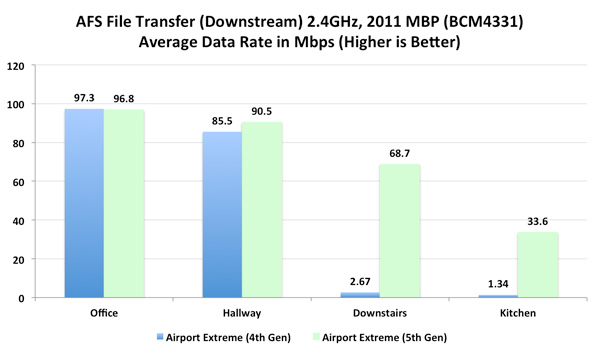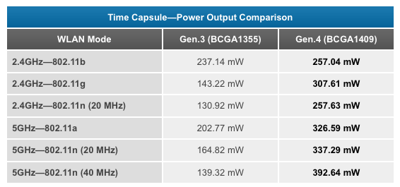Offiziell vermerkt wurde die WiFi-Verbesserung bei AirPort Extreme und Time Capsule seitens Apple nicht, bei letzterer war lediglich die höhere Speicherkapazität offensichtlich. Anandtech hat sich die WiFi-Hardware von Apple sowie die Unterlagen der Zulassungsbehörde FCC genauer angeschaut und in Tests im eigenen Haus festgestellt, dass Durchsatz und Reichweite des WiFi um ein Vielfaches verbessert wurden, sowohl auf 2,4 GHz als auch auf 5 GHz.