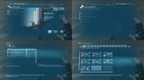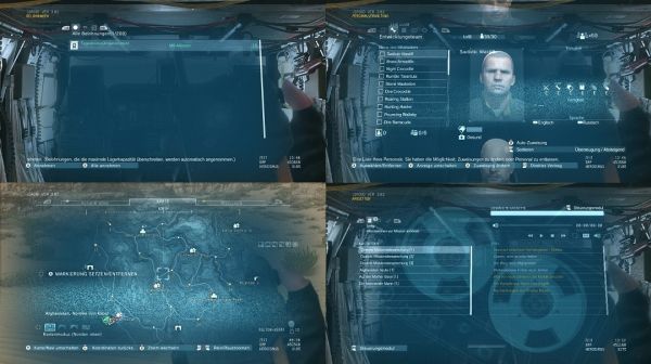 Praktisch, die Mother Base kann ich entweder direkt vor Ort oder eben auch von der Luftkommandozentrale aus optimieren. Hinzu kommen zahlreiche Anwendungsmöglichkeiten, wie zum Beispiel die Personalverwaltung der frisch rekrutierten Soldaten, die Entwicklung von Waffen und Gegenständen und ein Überblick über (un-)bekannte Ressourcen. Hinzu kommt die Ansicht der klassischen Missionsliste, sowie ein Protokoll und die abgefahrene Retro-Kassetten-Sammlung, anhand dessen ich mich in die Geschichte einhören oder auch der ausgewählten Musik lauschen kann. Da ich nicht immer Lust habe, meine Humanoiden-Sammlung eigenhändig in ihre Aufgabenbereiche einzuteilen, gibt es die praktische und unendlich viel Zeit sparende Funktion „Auto-Zuweisung“. Entsprechend seiner Fähigkeiten, wird jeder Soldat dem am besten für ihn geeigneten Posten zugewiesen. Außerdem habe ich vor jeder Mission die Möglichkeit, den Abwurfpunkt selbst zu wählen (sofern er für den Helikopter zugänglich ist) und kann in aller Seelenruhe die Karte studieren und meinen Feldzug planen.