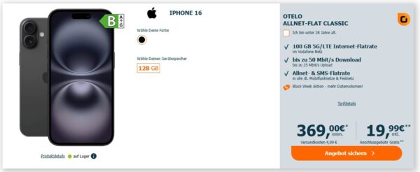 Apple iPhone 16 128GB + 100GB 5G + Alles-Flat im Vodafone-Netz für 19,99€/Monat – eff. 6,53€/Monat