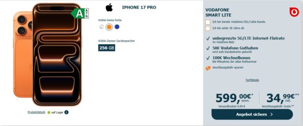 Apple iPhone 17 Pro 256GB + unbegrenztes 5G + Alles-Flat im Vodafone-Netz für 34,99€/Monat – eff. 3,11€/Monat