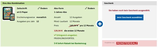 Bei Hobby + Freizeit gibt es das art Digital E-Paper Jahresabo für 121,04€ + bis zu 125€ Prämie.