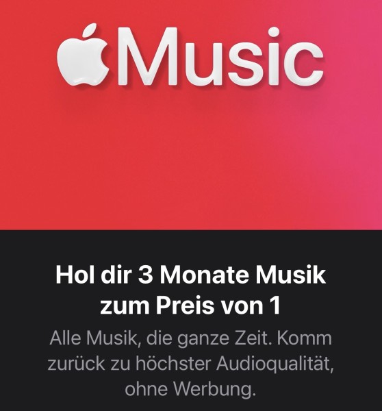 - nur für Apple Music Neukunden, teilweise auch Bestandskunden ohne Abo (oder Rabatt)