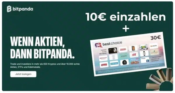 Traden und dabei direkt mal 20€ reinen Gewinn einsacken? Klingt nach einem Plan! Während eure Hausbank euch wahrscheinlich eher Gebühren abknöpft, hauen wir hier richtig einen raus: Werdet jetzt Neukunde bei Bitpanda, investiert läppische 10€ und kassiert dafür einen 30€ BestChoice-Gutschein von uns. Das ist profitabler als jeder Sparbuch-Zins der letzten 10 Jahre!
