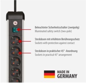 - Steckerleiste mit 6 Steckdosen in praktischer 45°-Anordnung für eine platzsparende Steckeranordnung, zudem mit erhöhtem Berührungsschutz für noch mehr Sicherheit