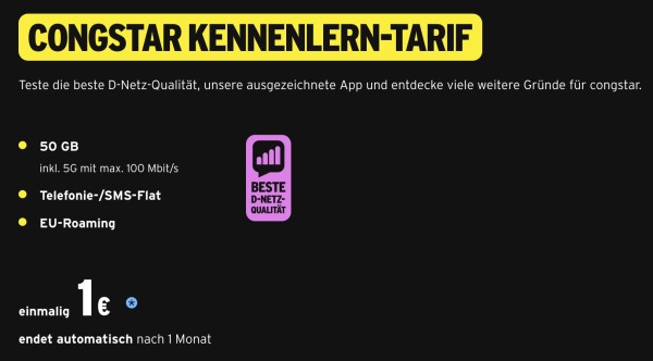 congstar Kennenlern-Tarif: 1 Monat 50GB Allnet-Flat im Telekom-Netz für 1€ testen – endet automatisch