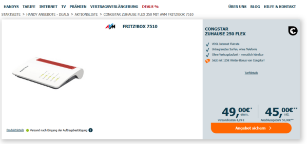 Für die Fritz!Box fallen einmalig zwar 49€ + 4,99€ Versand (Vergleich ~94€) an. Aber wenn ihr den Vertrag nur 1-2 Monate laufen lasst, bekommt ihr dank dem Winter-Bonus das Ganze mit einer Ersparnis!