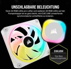 - Brillante Optik: 20 RGB-LEDs am Pumpenkopf und 34 pro Lüfter.