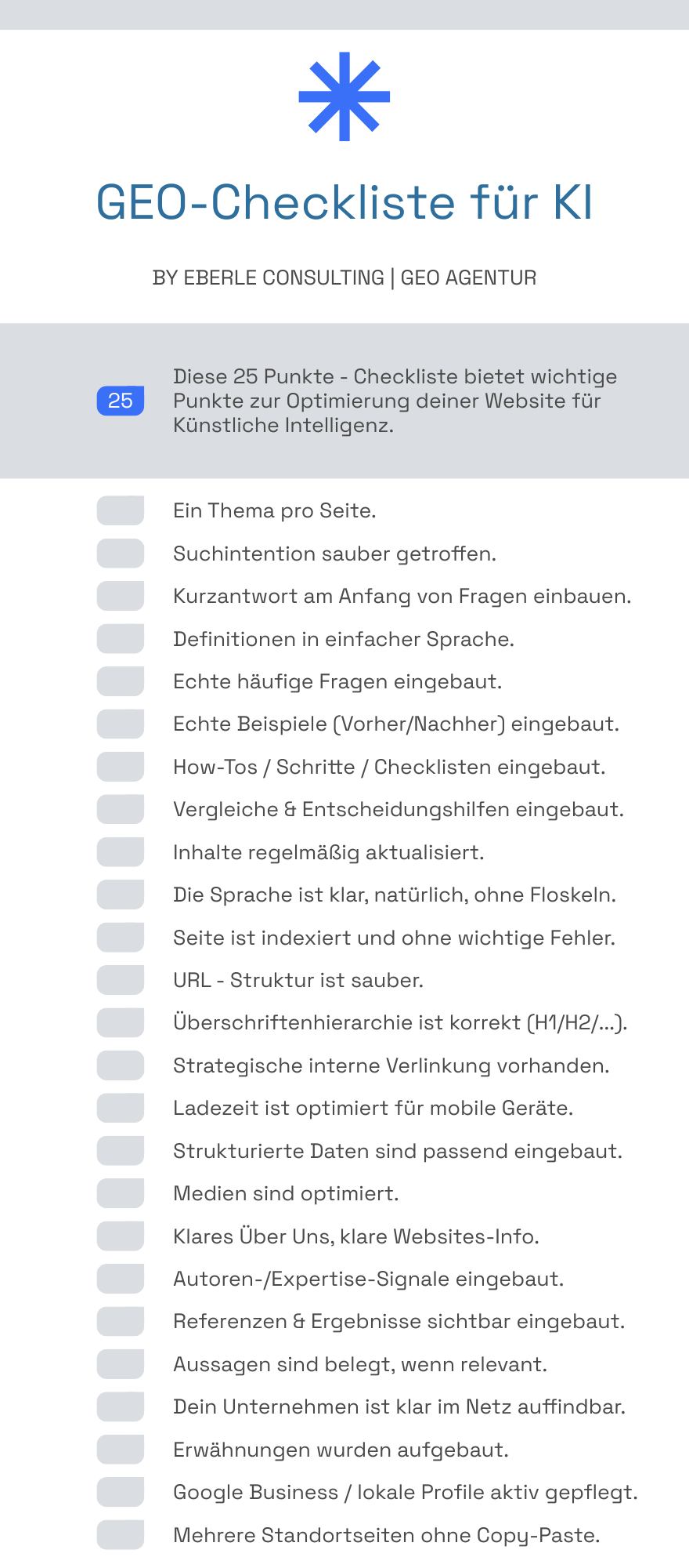 Die gute Nachricht: Du brauchst keine Tricks. Du brauchst Struktur, Klarheit und Inhalte, die wirklich helfen. Diese Checkliste von der GEO Agentur Eberle Consulting zeigt dir die 25 wichtigsten Punkte, die in der Praxis den Unterschied machen.