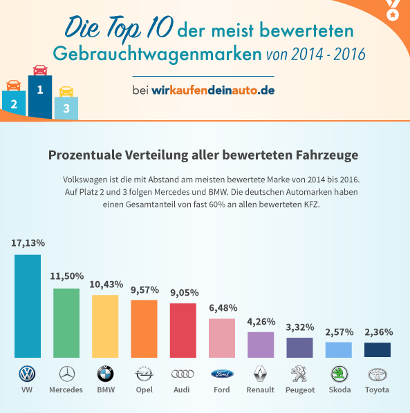 Die Top 10 der Gebrauchtwagenmarken innerhalb Deutschlands von 2014 bis 2016