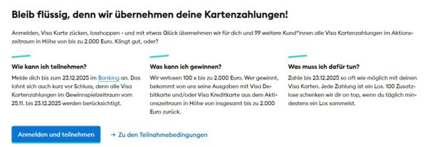 - Jede Visa Kartenzahlung zwischen dem 25.11. und 23.12.2025 ist ein Los
