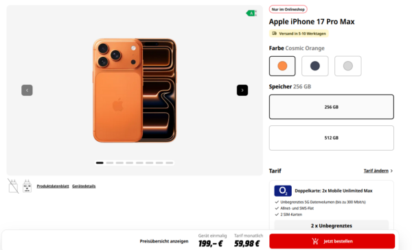 Bei MediaMarkt bekommt ihr gerade das Apple iPhone 17 Pro Max (256GB) im Doppelpack-Tarif.