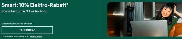 Ihr bekommt mit dem Code TECHNIK26 ganze 10% Extra-Rabatt auf viele Technik-Artikel. Der Code ist zwei Mal pro Account einlösbar und der Rabatt ist gedeckelt bei 50€. Die Stückzahlen sind teilweise sehr begrenzt!