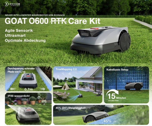 ECOVACS Goat O600 RTK Care Kit Mähroboter ohne Begrenzungskabel für 499€ – bis 600qm, RTK+Vision-Navigation