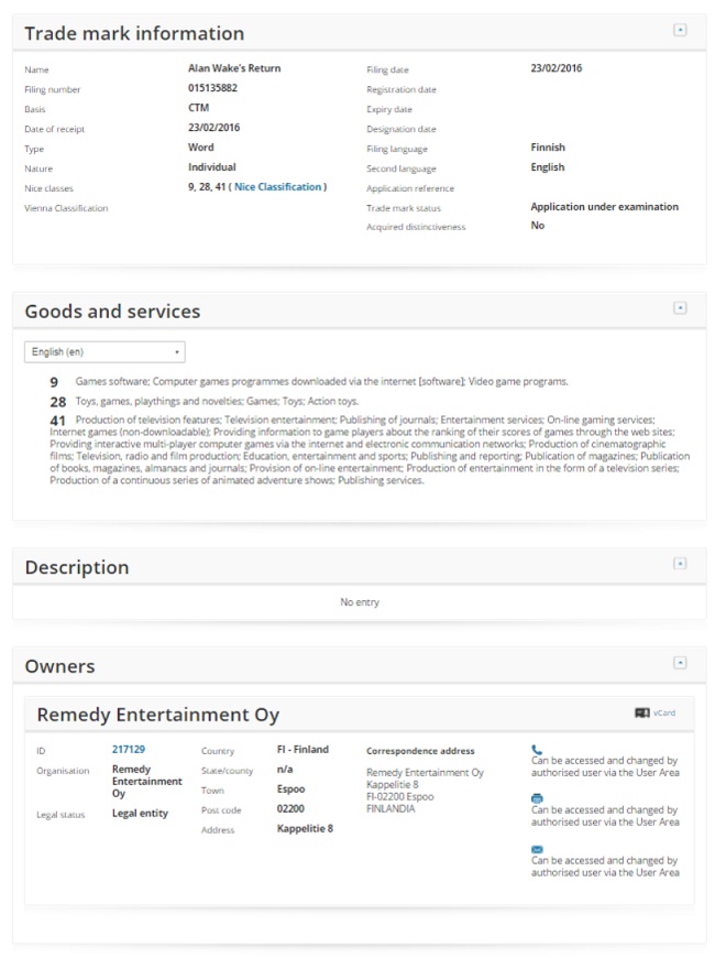 Remedy Entertainment reichte einen Markenantrag mit dem Namen Alan Wakes’s Return bei OHIM ein. Hier das gute Stück live und in Farbe: