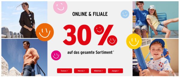 Bei Ernsting’s family gibt es gerade 30% Rabatt auf das gesamte Sortiment für euch, womit ihr hochwertige Mode für Babys, Kids und Erwachsene extrem günstig abstaubt.