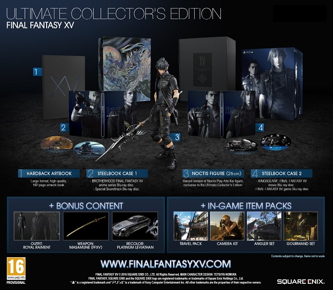 Die Ultimate Collector’s Edition enthält neben dem Spiel ein 192-seitiges Artbook, eine 26cm große Noctis Figur, den Film "Kingsglaive: Final Fantasy XV" auf Blue-ray, die Anime-Serie "Brotherhood Final Fantasy XV", einen Soundtrack, zwei Steelbooks sowie Bonusinhalte und In-Game Pakete. Viel Glück allen, die es versuchen.
