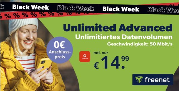 - freenet Vodafone Allnet + Unlimited Datenflat (50 MBit/s) für 14,99€/Monat