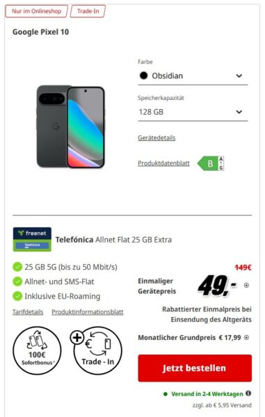 Nice, bei MediaMarkt bekommt ihr das Google Pixel 10 + 25GB 5G + Alles-Flat im o2-Netz für 17,99€/Monat