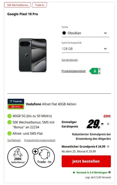 Stark: Bei MediaMarkt könnt ihr euch jetzt das Google Pixel 10 Pro + 40GB 5G + Alles-Flat im Vodafone-Netz für 24,99€/Monat sichern