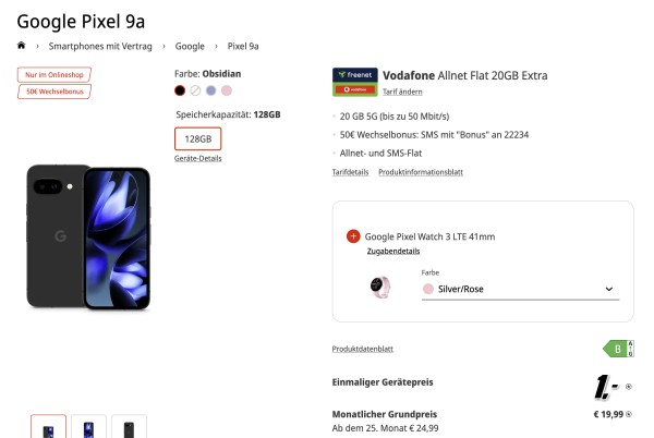 Google Pixel 9a (128GB) + Pixel Watch 3 LTE für 1€ + Vodafone Allnet-Flat mit 20GB für 19,99€/Monat + 50€ Wechselbonus