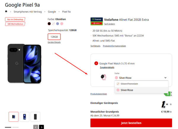 Google Pixel 9a + Pixel Watch + 20GB 5G + Alles-Flat im VF-Netz für 19,99€/Monat
