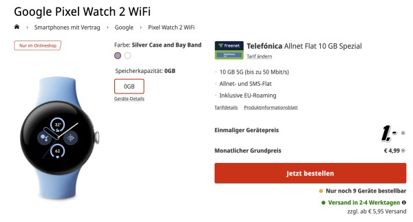 Google Pixel Watch 2 WiFi für 1€ + o2 Allnet-Flat mit 10GB 5G für 4,99€/Monat
