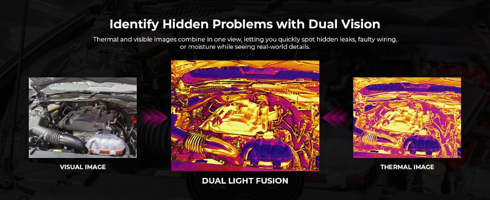 Die GH340 vereint Wärmebild- und sichtbare Optik in Echtzeit, sodass Wärmeanomalien im Kontext sichtbar werden. Diese Fusion hilft, versteckte Probleme wie Lecks, elektrische Fehler, Isolationslücken oder Feuchtigkeit schnell zu lokalisieren – bei gleichzeitiger Darstellung der umgebenden Strukturdetails. Ergebnis: schnellere Diagnose, weniger Ratespielerei, zuverlässigere Ergebnisse.