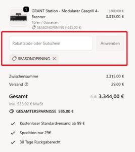 Ihr könnt die Station direkt im Burnhard-Shop konfigurieren. Wählt aus, ob ihr im Unterschrank lieber Türen oder Soft-Close-Schubladen hättet und ob ihr die klassischen Gusseisen-Roste für das perfekte Branding oder pflegeleichte Edelstahl-Roste bevorzugt. Ein Gutscheincode ist nicht erforderlich. Die Lieferung erfolgt sicher per Spedition innerhalb von 4-6 Werktagen.