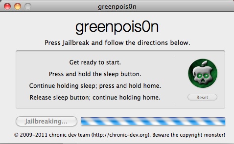 Diesmal wurden die Mac-User zuerst bedient: Bisher nur in einer OS X-Version steht mit dem aktuellen Greenpois0n nun ein Jailbreak vom Chronic Dev Team zur Verfügung, der den tethered Reboot überflüssig macht. Greenpois0n kann über einen bestehenden Redsn0w-jailbreak darüber installiert werden, bei noch nicht geknackten Geräten ist ein Neueinspielen von iOS 4.2.1 via iTunes mit laufendem TinyUmbrella notwendig, um den Baseband-Upgrade zu verhindern.