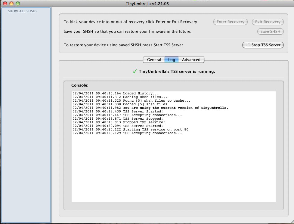3. TTS-Server starten und prüfen, ob er tatsächlich läuft (via “Log”-Button – der TTS-Server verhindert das Baseband-Update, insbesondere für Unlocker ist das immens wichtig!)
