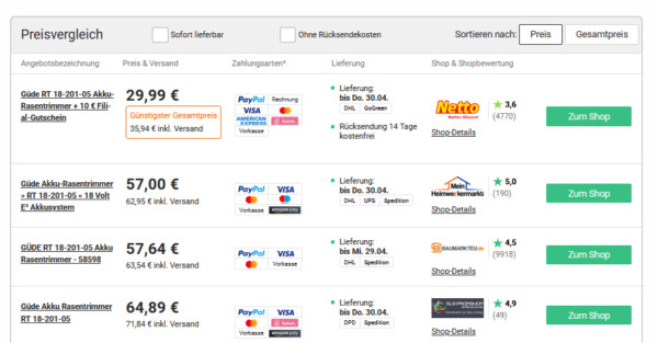 Wir haben für euch den Check bei Idealo gemacht. Dort wird der Güde Akku-Rasentrimmer aktuell nicht unter 63€ (inklusive Versand) gelistet. Bei Netto zahlt ihr heute inklusive der Versandkosten von 5,95€ nur knapp 36€.