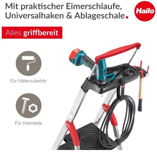 Gibt es Zubehör? Ja, die Topline-Serie ist kompatibel mit diversem Hailo-Zubehör wie Eimerschlaufen oder Wechsel-Füßen.