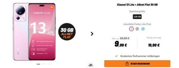 Nice, bei klarmobil bekommt ihr das Xiaomi 13 Lite + 30GB LTE + Alles-Flat im VF-Netz für 9,99€/Monat