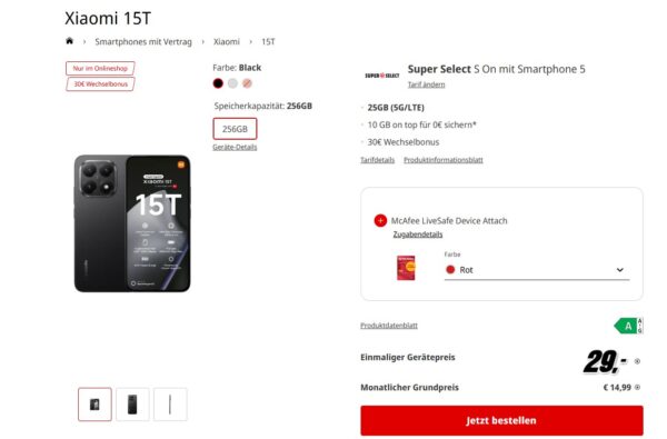 Nice, bei MediaMarkt bekommt ihr das Xiaomi 15T 256GB + 35GB 5G + Alles-Flat im o2-Netz für 14,99€/Monat
