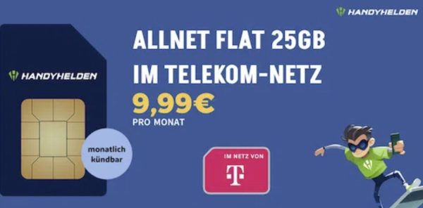 - Handyhelden: 5G Allnet Flat im Telekom-Netz mit 25GB für 9,99€ pro Monat