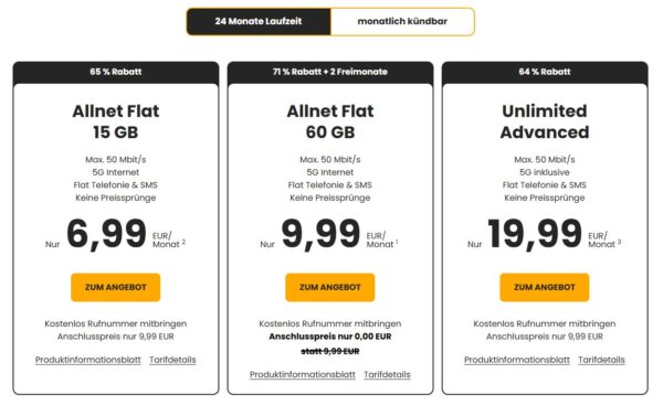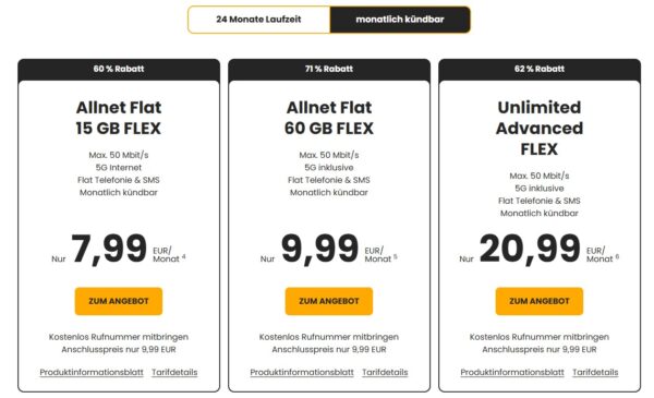 Es gibt monatlich kündbare Tarife (1€ teurer) und welche mit 24 Monaten Mindestvertragslaufzeit.