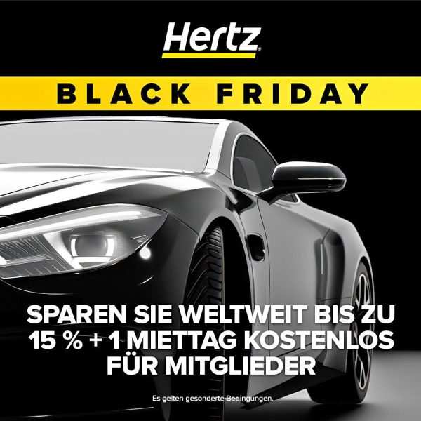 - Hertz Black Week Deal: bis zu 15% Rabatt + 1 Miettag gratis