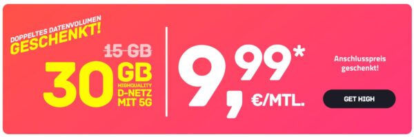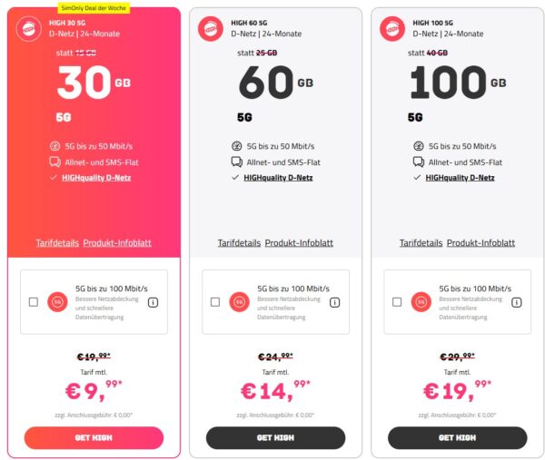 High-Mobile funkt im besten Telekom-Netz, dort bekommt ihr 30GB 5G Allnet-Flat für 9,99€/Monat // 60GB für 14,99€/Monat //100GB für 19,99€/Monat