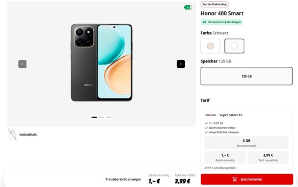 🔥 Honor 400 Smart für 1€ + 6GB 5G + Alles-Flat im o2-Netz für 3,99€/Monat – eff. 0,57€/Monat