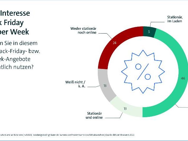 Der bevorstehende Black Friday und die darauffolgende Cyber Week sind für einen Großteil ein willkommener Anlass für eine Einkaufstour im Internet. 64 Prozent der Online-Shopper wollen die entsprechenden Angebote in diesem Jahr nutzen und auf Schnäppchenjagd gehen – davon 46 Prozent im Netz und 5 Prozent im stationären Handel. 13 Prozent wollen sowohl stationär als auch online Black-Friday-Angebote wahrnehmen. Weitere 13 Prozent sind noch unentschlossen. Für 24 Prozent spielen Black Friday und die Cyber Week keine Rolle. Handels- und Aktionstage wie Black Friday oder die Cyber Week sind die umsatzstärksten Tage im Online-Handel.