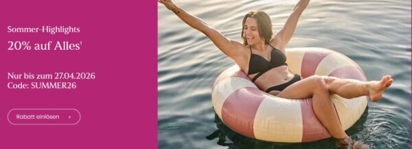 - Aktionsbedingungen: Der Code „SUMMER26“ muss im Warenkorb eingegeben werden. Es werden dann automatisch 20% auf alle Styles vom Warenkorbwert abgezogen. Kein Mindestbestellwert. Der Rabatt ist nicht mit anderen Rabattarten kombinierbar.
