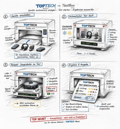 In den vergangenen Tagen wurden uns Informationen zugespielt, die so eigentlich nie an die Öffentlichkeit gelangen sollten. Neben ersten Hinweisen auf ein internes Projekt bei TopTechNews sind nun auch mehrere Konzeptzeichnungen aufgetaucht, die einen völlig neuen Ansatz im Bereich Produkttests zeigen.