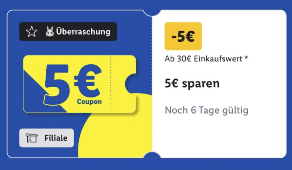 Heute können Nutzer in der LIDL Plus App einen 5€ Coupon sichern, der bis 29. März bei Einkäufen ab 30€ gültig ist.