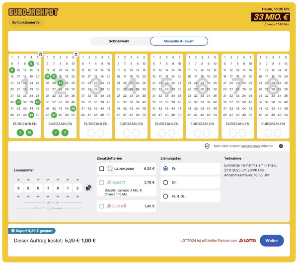 Lotto24: für 1€ den EuroJackpot knacken (staatl. Lotto/5€ Rabatt) – 33 Mio Jackpot